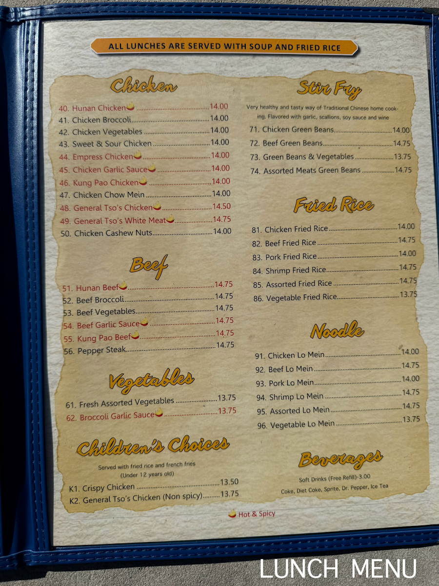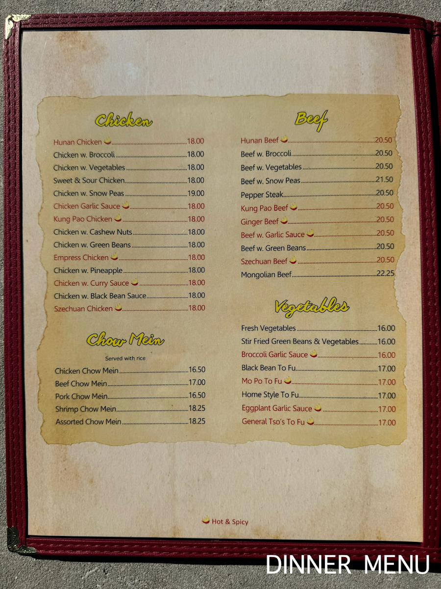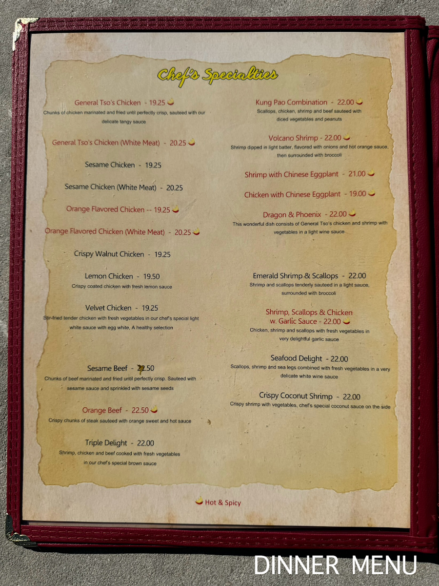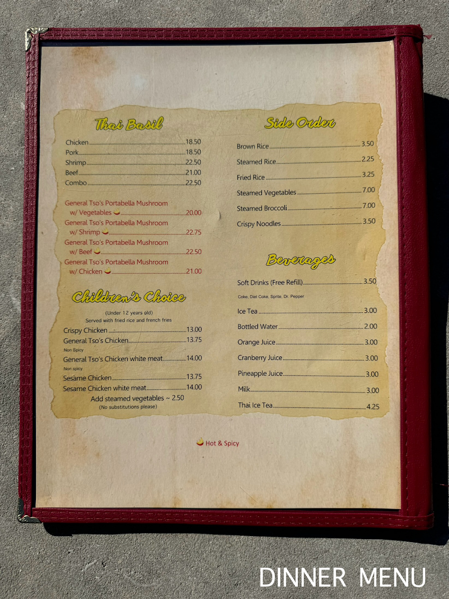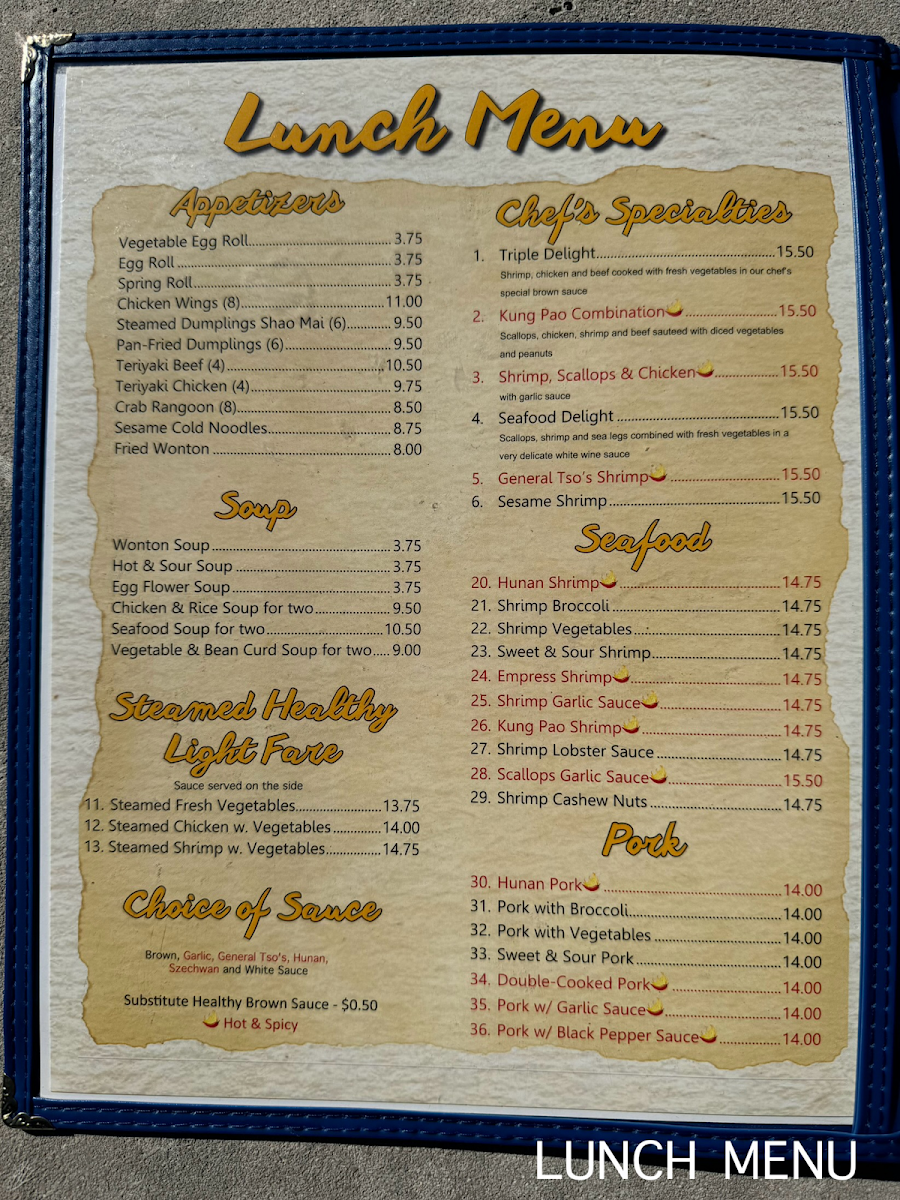 Appetizers like Crab Ragoon and Vegetable Egg Rolls offer a flavorful start, while hearty entrées and chef specialties provide satisfying options to explore. The portion sizes encourage sharing or saving a meal for later, matching the relaxed, inviting vibe of the restaurant. Overall, the menu complements the setting’s calm and friendly atmosphere, making it a fitting choice for everyday dining experiences.